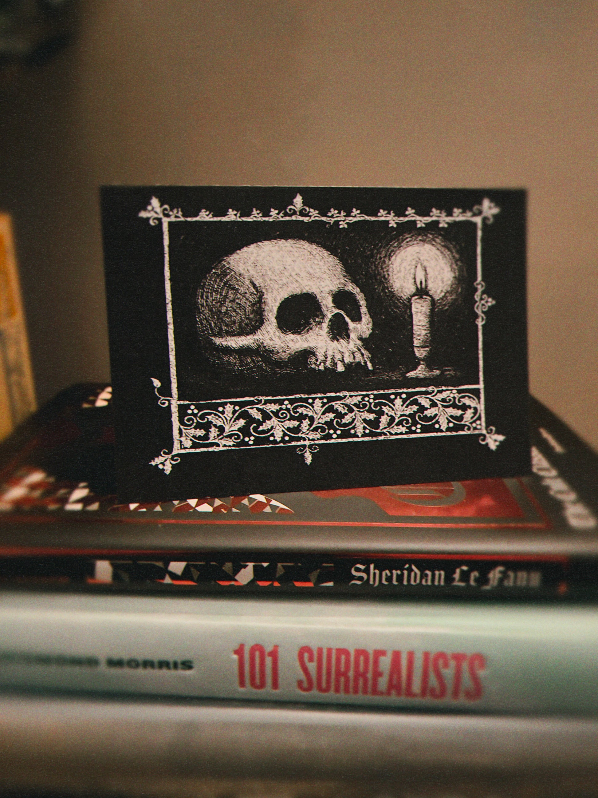Each piece is handmade by artist Jean Saiz one mark at a time, inspired by the ghosts of medieval art, gothic grimoires, mythology, and some shadowed corners of cursed creation.