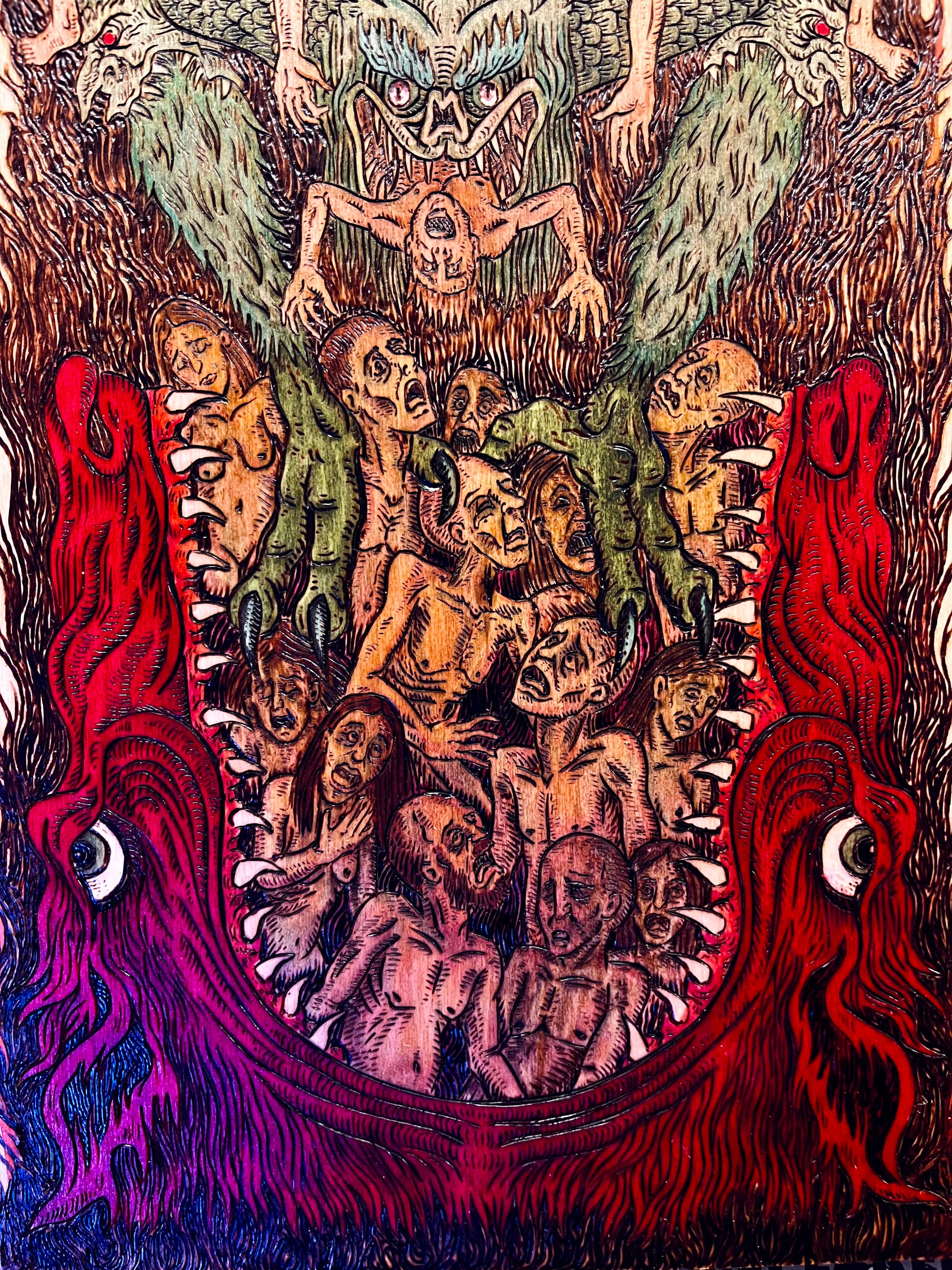 This handmade wood burned plaque features a medieval Satan in the fire pits of a hellmouth surrounded by tortured souls. This is a statement piece for any collector of macabre and devilish art.