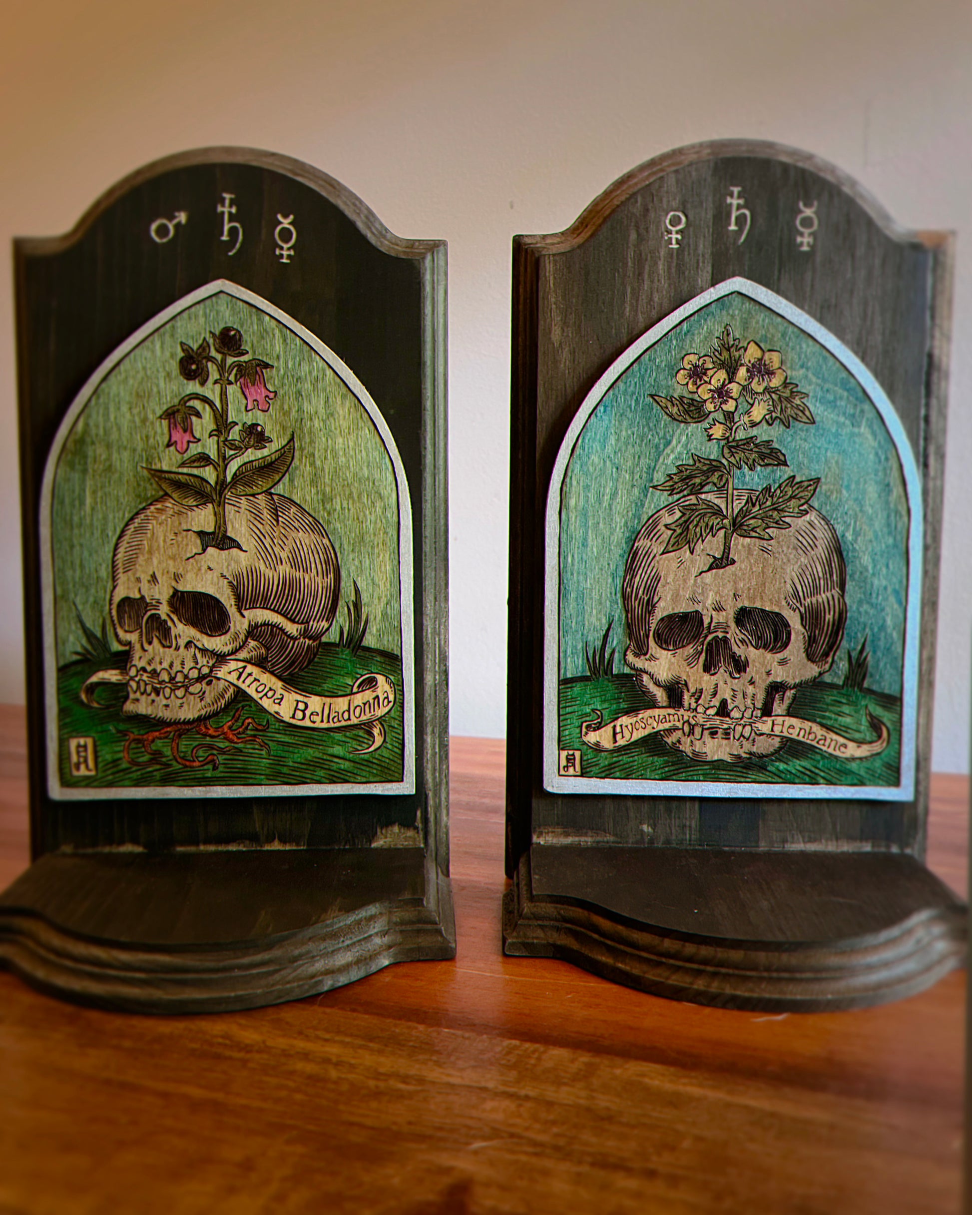 Summon the beautifully damned with Thee Baneful Ones. Inspired by the poison botanicals of witchcraft, the piece evokes Memento Mori motifs with Atropa Belladonna (Deadly Nightshade) and Henbane, plants steeped in folklore and shadowed rituals. These magick plants whisper of potions, curses, and ancient spells, bringing a touch of nature to your gothic altar or display.